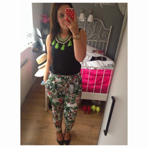 Love love love these tropical print co-ordinates! They are ridiculously comfy and felt perfect for a sunny evening in Tenerife. The pants have a great detailing at the bottom (which I know is hard to see) which allows your shoes to be shown off more! I teamed this with my large, green float necklace and a pop of orange lipstick! I would wear both the pants and t-shirt as seperates, with red shoes and lipstick!